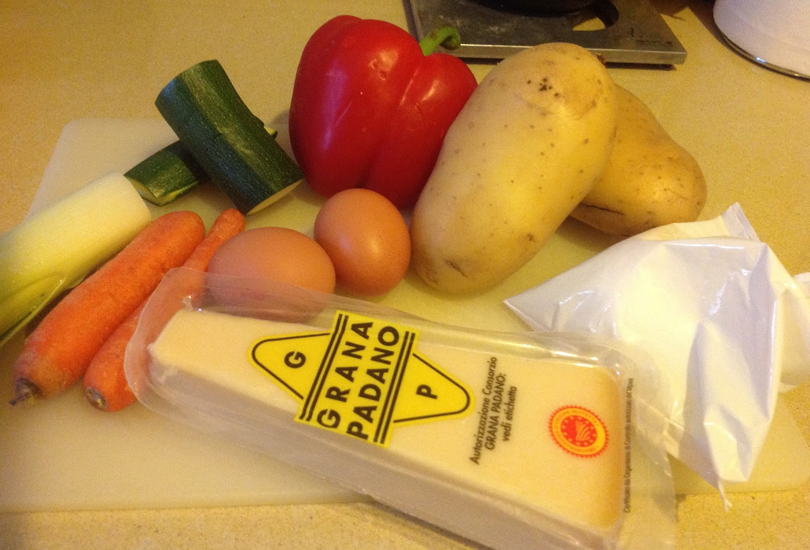 Cartofii se curata si se pun la fiert. Cand cartofii sunt fierti bine se zdrobesc ca pentru piure si se lasa la racit. Intr-o tigaie am pus la innabusit cu o cescuta de apa legumele taiate cubulete cam 10 minute pana cand s-au inmuiat, apoi le-am pus la racit. Cand s-au racit, am amestecat bine piureul, legumele, ouale, mozzarella si parmezanul (se pastreaza putin parmezan pentru pus deasupra placintei).